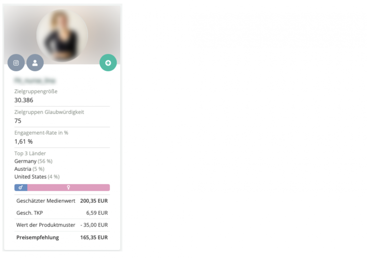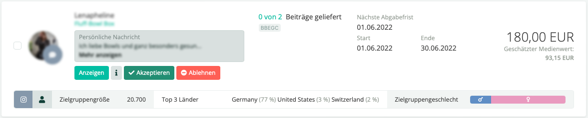 Wir zeigen diese Zahl auch neben dem Angebot / der Anfrage von Influencern an, damit du sie (neben anderen Parametern) berücksichtigen kannst, wenn du entscheidest, ob du eine bestimmte Kooperationsanfrage annimmst oder nicht.