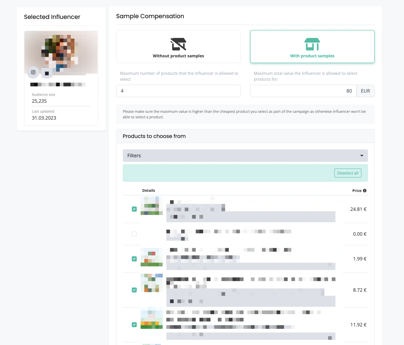 - Für Kooperationen mit Provisionszahlungen kannst du einen Prozentsatz für die Verkaufsprovision des Influencers festlegen. Für jeden vermittelten Verkauf erhält der Influencer den festgelegten Provisionsprozentsatz. Wir verfolgen dies über einen personalisierten Rabattcode, den wir automatisch für jeden Influencer individuell erstellen. Diese Codes werden automatisch in deinem E-Commerce-Shop erstellt, sobald du die Zusammenarbeit mit einem bestimmten Influencer akzeptierst. Für jeden Code kannst du einen Rabattprozentsatz festlegen. Wir verfolgen die Einlösung der Codes automatisch und berechnen die Provision für jeden Influencer. Du kannst die Provision auch direkt über die Plattform an den Influencer auszahlen.