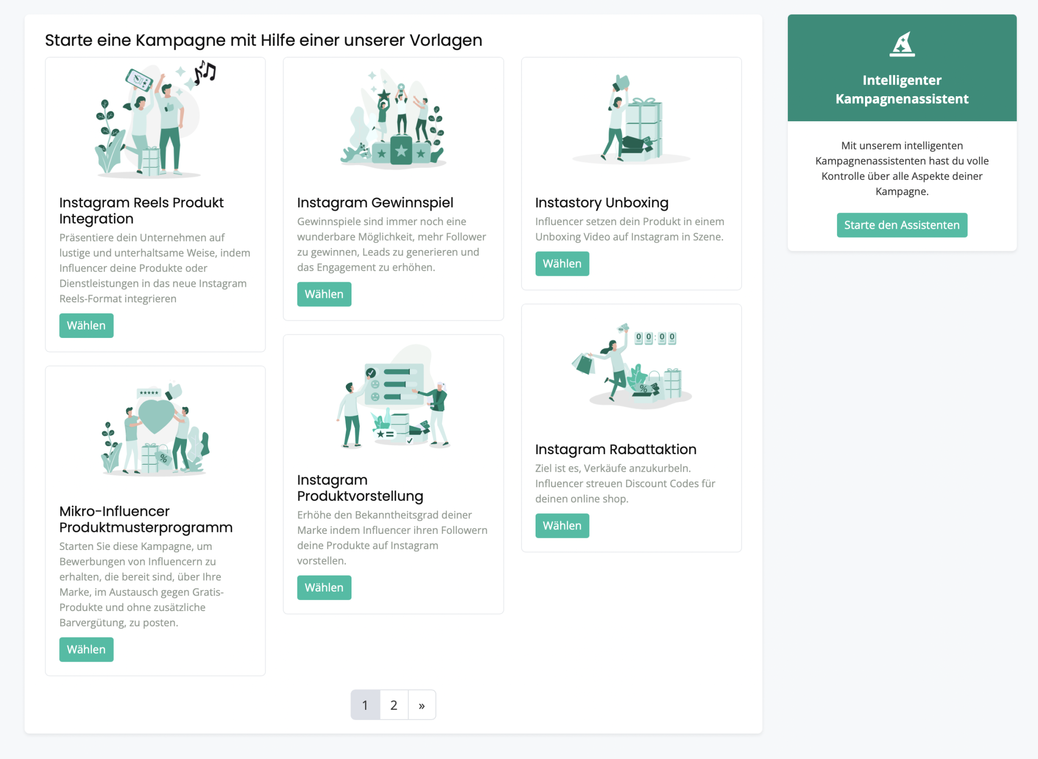 Wenn du eine Marken- oder Produktpromotion mit mehreren Influencern durchführen möchtest, ist es nützlich und sehr praktisch, eine Kampagne zu veröffentlichen, um Bewerbungen von interessierten Influencern zu erhalten - eine großartige Möglichkeit, Influencer zu finden, da sich nur diejenigen bewerben werden, die an deinem Produkt interessiert, die mit dem Briefing einverstanden sind und auch Zeit dafür haben. Insgesamt bietet dir "Kampagnen" 4 Funktionsmöglichkeiten: