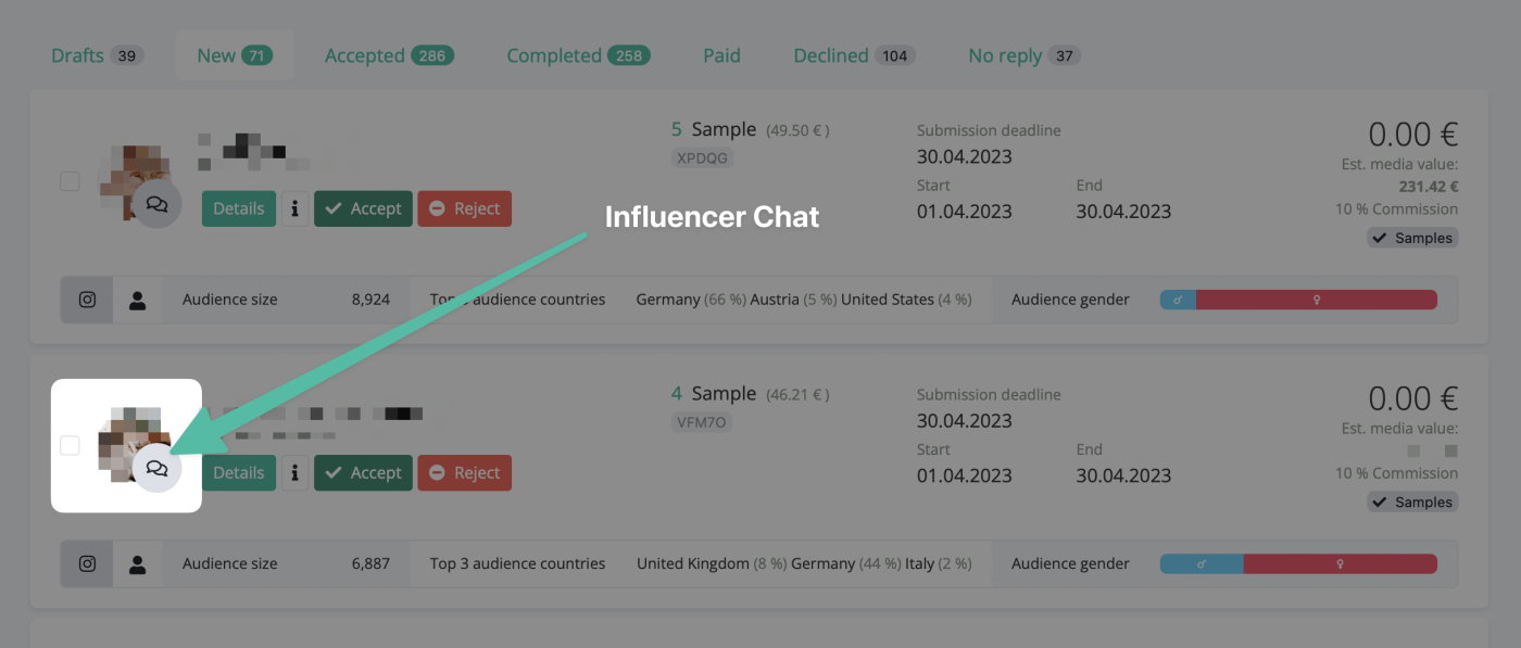 - Wenn du den Influencer kontaktieren möchtest oder musst (z.B. weil die Produkte später als erwartet ankommen), kannst du den Influencer auch über "Chat" erreichen. Klicke einfach auf die Chatblase neben dem Bild des Influencers: