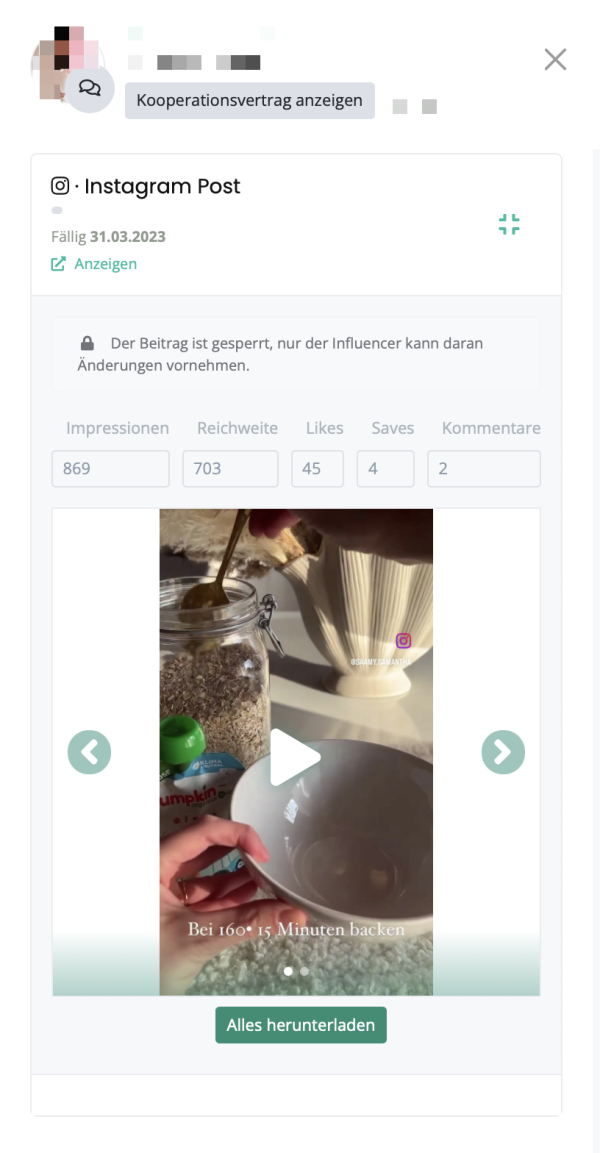 c. die abgeschlossenen Influencer-Kooperationen unter dem Reiter "Abgeschlossen". Das heißt, nur wenn die Kooperation des Influencers auf diesen Reiter springt, sind alle Stücke vom Influencer geliefert worden. Außerdem lädt der Influencer die Inhalte hoch, die von dir angefordert wurden. Auch der Influencer füllt die Daten der Kooperation aus. Impressionen, Reichweite, Saves, Kommentare und Likes, wenn zum Beispiel ein Instagram-Post angefordert wurde. Bitte beachte auch, dass alle Inhalte zum Download bereitstehen, damit du sie für deine Zwecke nutzen kannst (bitte vermerke dazu den Zusatz cc creative common rights: "CC BY-NC-ND 4.0" oder "CC BY 4.0" in deinem Briefing!). Wenn der Influencer eine zusätzliche Vergütung erhält, kannst du die Zahlung jetzt über den linkr-Menüpunkt "Zahlung" vornehmen. Wenn ein Influencer die Zusammenarbeit nicht abgeschlossen hat, ist die Zahlung aus Sicherheitsgründen nicht möglich (mehr dazu im nächsten Abschnitt).