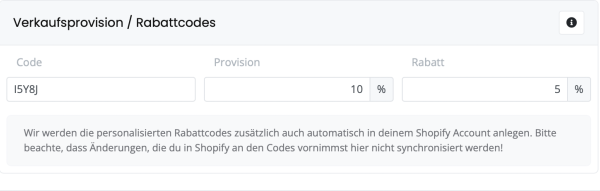 - personalisiere deine Provisionscodes, indem du einfach den sichtbaren Code überschreibst. Sobald du ihn gespeichert hast, wird er automatisch auch in deinem Shop-Backend personalisiert: