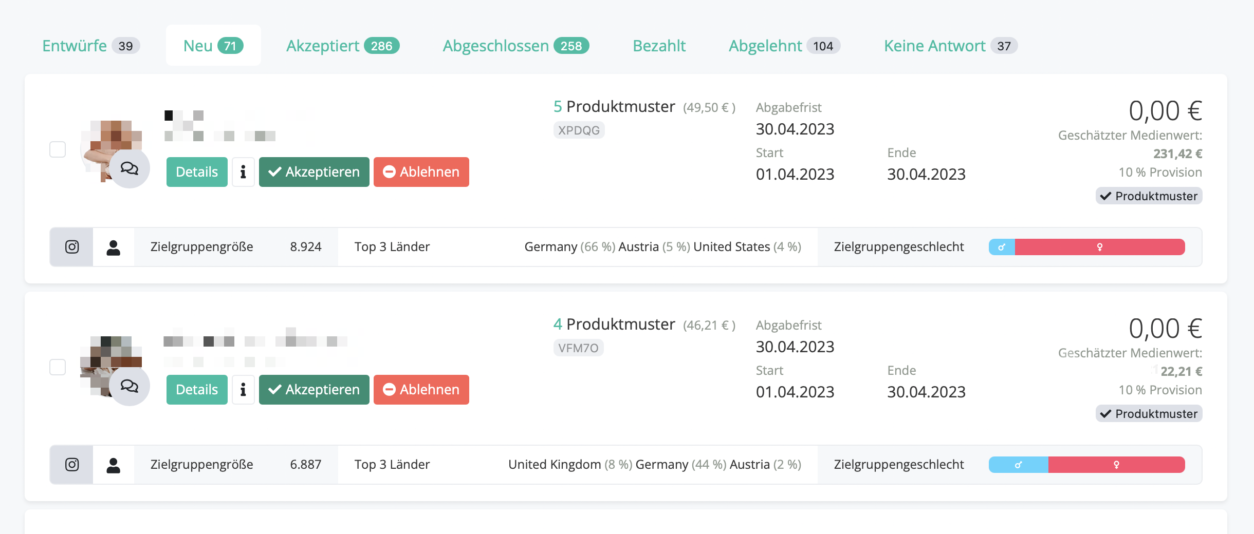 f. die Influencer, die auf dein Kooperationsangebot überhaupt nicht mit "Angenommen" oder "Abgelehnt" geantwortet haben, unter dem Reiter "Keine Antwort".