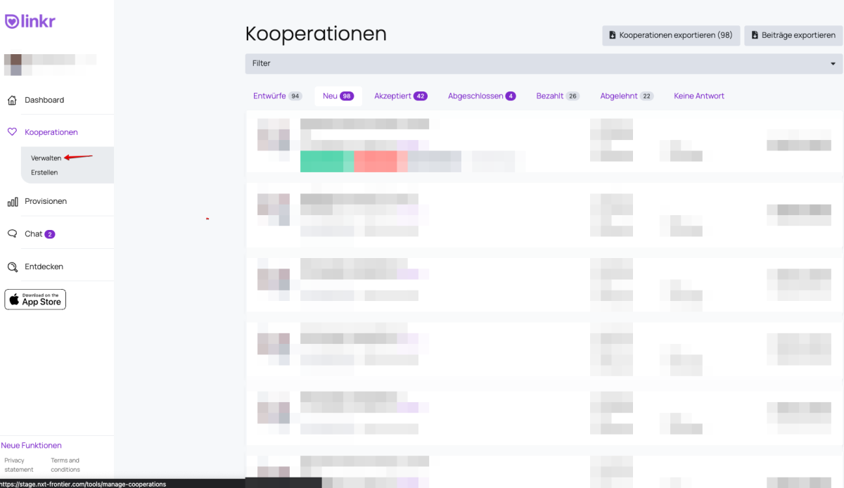 Schritt 2: Navigiere zu Kooperationen → Verwalten-Seite: Nach dem Einloggen navigiere zum Bereich "Kooperationen". Suche nach dem Tab "Verwalten".