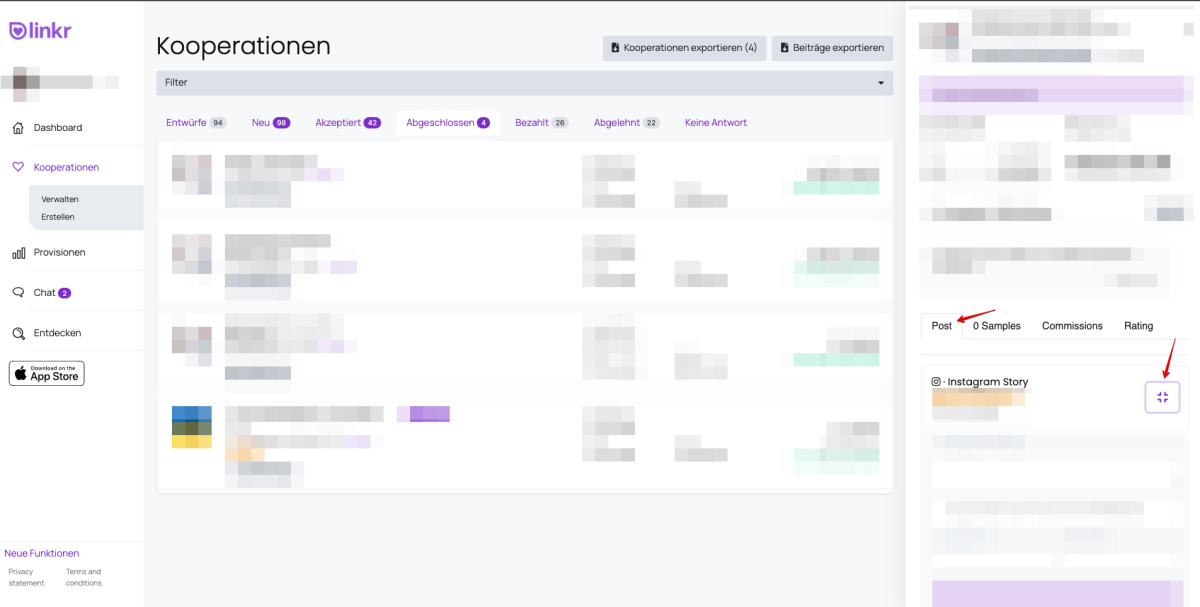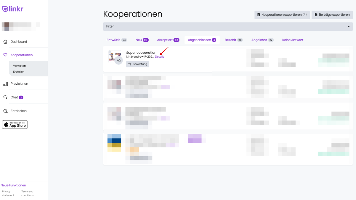 Schritt 3: Finde und Öffne die entsprechende Kooperationsdetails-Seite: Finde die Kooperation, für die du Impressions- und Reichweiten-Daten eingeben möchtest. Klicke auf die Schaltfläche "Details", um das Fenster mit den Kooperationsdetails zu öffnen. Dieses Fenster bietet einen Überblick über die Kooperation.