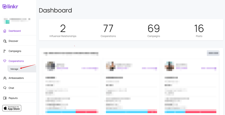 Access Cooperations: Navigate to the "Cooperations" → Manage section.
